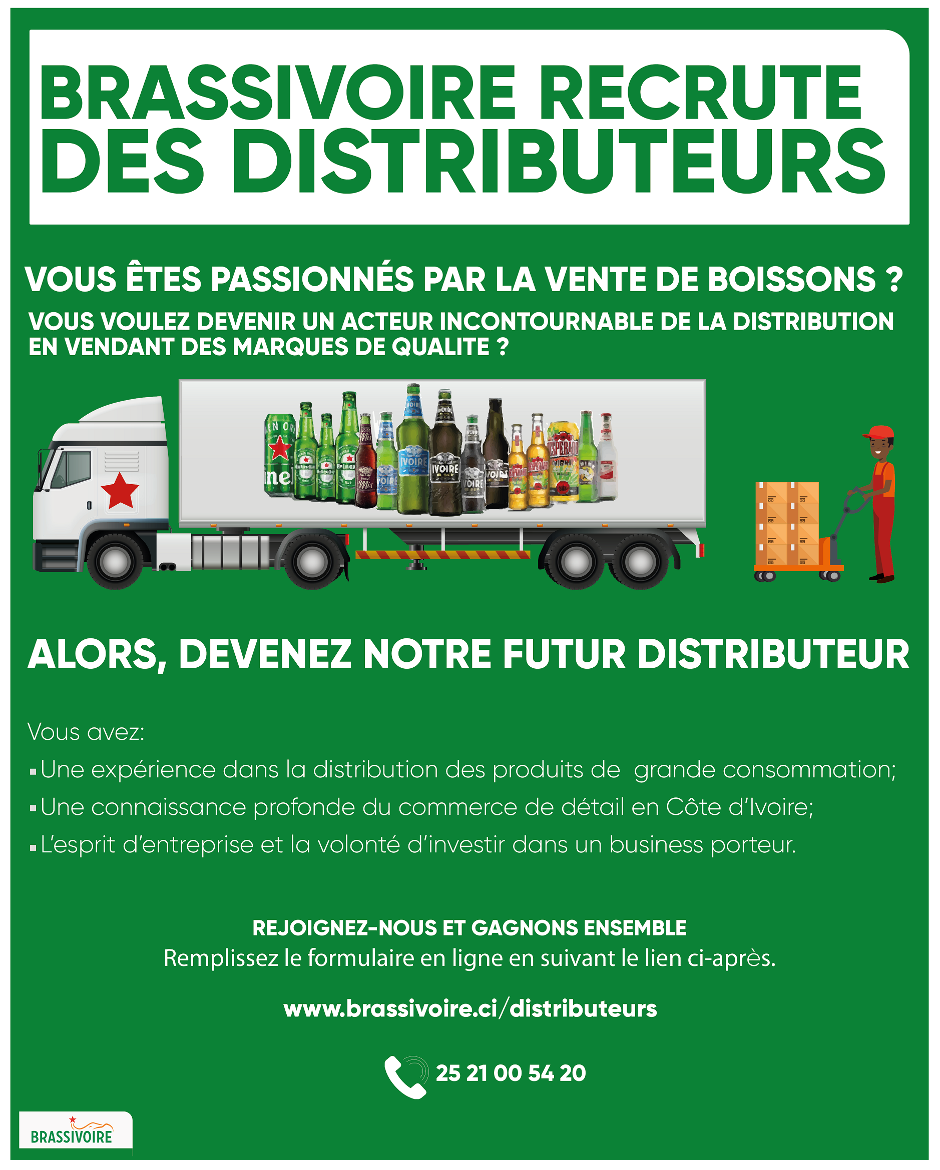 Vous souhaitez devenir un acteur incontournable de la distribution des marques de qualité. Vous désirez accroître votre business en vendant des produits de qualité notamment Heineken, Ivoire mix, Ivoire black, Ivoire classique, Desperados, Smirnoff Ice, Rhino …Voici une belle opportunité qu’offre Brassivoire en ce moment (Voir communiqué officiel ci-dessous) !