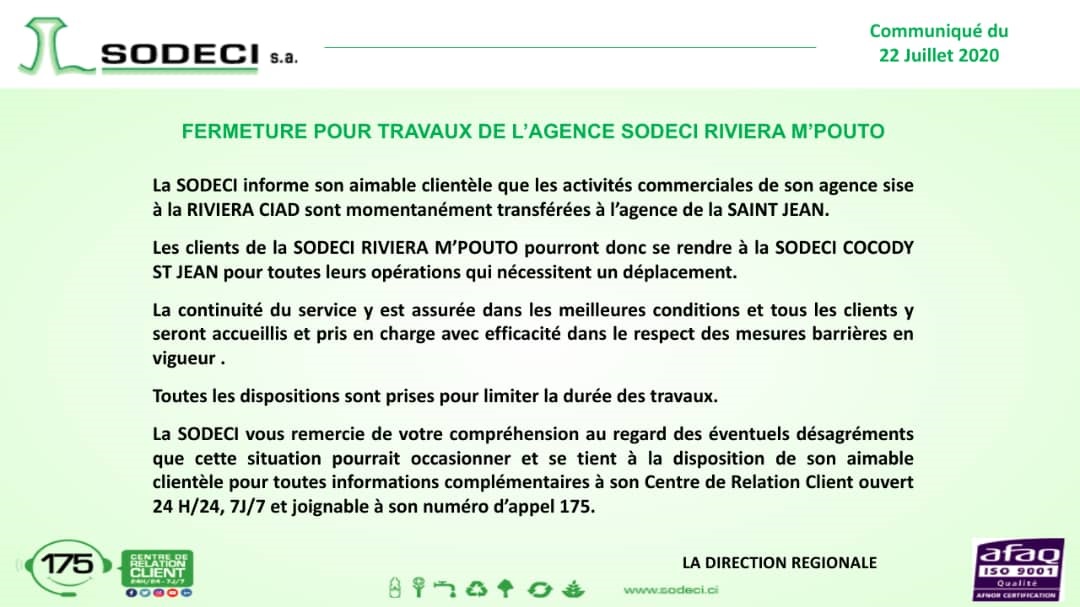 Communiqué SODECI : Fermeture de l’Agence Riviera M’Pouto ( Travaux) ! Guidance Publié le 22 Juil 2020 0 Partager 0 Partager FacebookTwitterWhatsAppCourriel