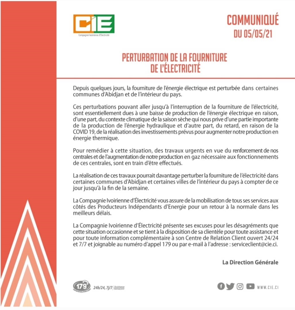 Coupures de courant : la part de vérité de la CIE !!! Feed back On 5 Mai 2021 0 Partager 0 Partager FacebookTwitterWhatsAppCourriel