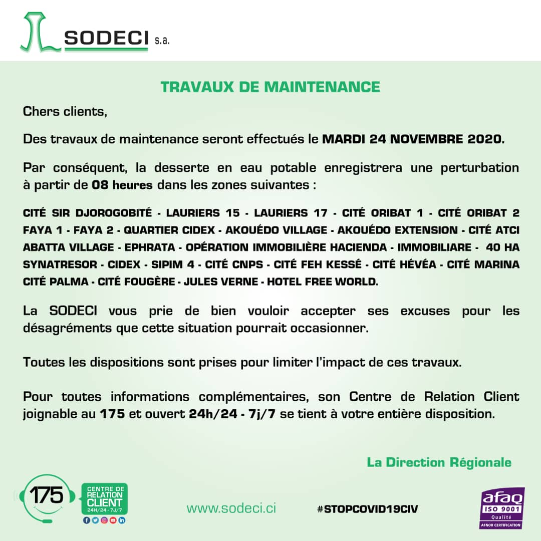 Important communiqué Sodeci: zone Cocody-Bingerville Guidance Publié le 23 Nov 2020 L'eau reviendra sous peu ( Sodeci) 0 Partager 0 Partager FacebookTwitterWhatsAppCourriel
