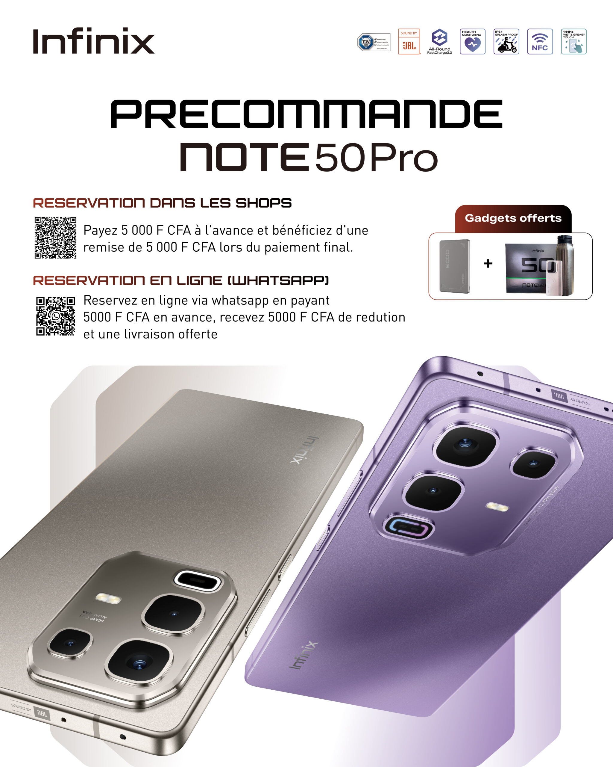 Du 17 au 27 avril, payez seulement 5 000 FCFA pour réserver votre NOTE 50 PRO et recevez 5 000 FCFA de réduction supplémentaire le jour de la livraison. En bonus : un powerbank sans fil offert et une boîte cadeau de luxe.